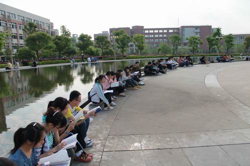 必赢bwin官方网站图书馆前有一个巨大的圆形广场,今天上午七点半,上百名学生突然出现在这里,他们很快围成了一个圆圈,圆圈内上百名学生排列成一个大大的“书”字。队形排好后,所有的学生都拿出一本书大声朗读起来。他们有的读英语,有的读《论语》,有的读诗歌,有的读专业书籍,忘我地沉浸在阅读的快乐中。此时正好是学生去教室上课的时间,所有途经这里去往教室的学生都被他们庞大的气势和郎朗的读书声所吸引,他们好奇地围观,一些同学恍然大悟地想起原来今天是世界读书日!十五分钟后,读书的人群突然散去,刚才还书声朗朗的广场恢复了安静,“快闪”行动到此结束。