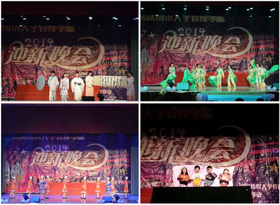 晚会在一曲新颖独特、动感激昂的影子舞中拉开帷幕,幽默诙谐的小品《难上901》以其贴近校园生活的情景、经典的台词、夸张的动作惹得现场观众捧腹大笑;现代舞《青春的脉动》以青春为题,高啭的舞曲彰显了管院的活力与风采;而充满了异域风情的《天竺少女》仿佛把人们带到了竹林深处,听脚铃叮当,观婆娑舞姿;结合了乐器、舞蹈、书法三者为一体的古风曲《青花瓷》、尽显北漂艰难与执着的情景朗诵《蚁族》、讲述贫家子弟在父爱支持下创业成功的哑剧《梦不落》,一个个表演将全场气氛逐渐推向高潮。而整场晚会最有创意的表演当属《小人舞》,90cm的“小人们”随着不同的音乐在桌子上跳着摩登的舞步,全场欢呼尖叫不断,其激情瞬间点燃了全场。