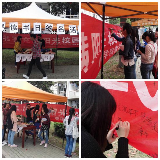 2015年4月23日,必赢bwin网址大全读书社在阳光校区一食堂侧门举办“世界读书日”签名活动。同学们在世界读书日签下自己的名字,立志好读书,读好书,并向其他同学宣传读书好。活动引起广泛关注,一位留学生也在横幅上签名表示支持。