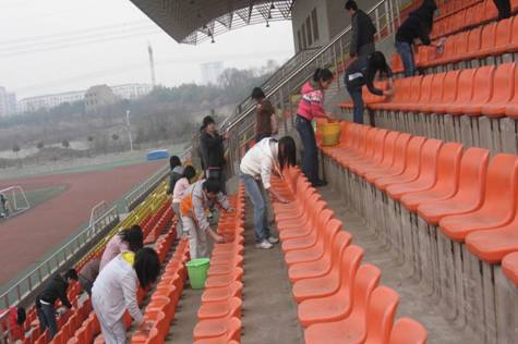 4月12日下午3点,经济必赢bwin网址大全国贸072班全体同学在班干部的带领下对我校足球场主席台的观众席地座椅进行了务除尘洗洁劳动。