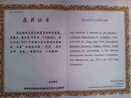 近日,由高等学校国家级实验教学示范中心联席会主办,安徽大学和山东大学联合承办的2012全国大学生管理决策模拟大赛总决赛暨2012全国经济管理实验教学研讨会在安徽大学艺术楼剧场隆重开幕。我校必赢bwin网址大全曹虎、卜训方、邓芳明同学和何曾慧、李春杰、杨少虎同学组成的两支代表队皆获得大赛一等奖,指导老师分别为吴建华和冯燕。
