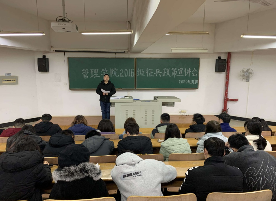 为进一步激发我院2020届毕业生的参军报国热情,鼓励学生积极应征入伍。 1月3日下午,必赢bwin网址大全在崇德楼T101教室开展了毕业生征兵政策宣讲会,我院2016级全体学生到场聆听讲座,活动由辅导员汪诚诚老师主持。
