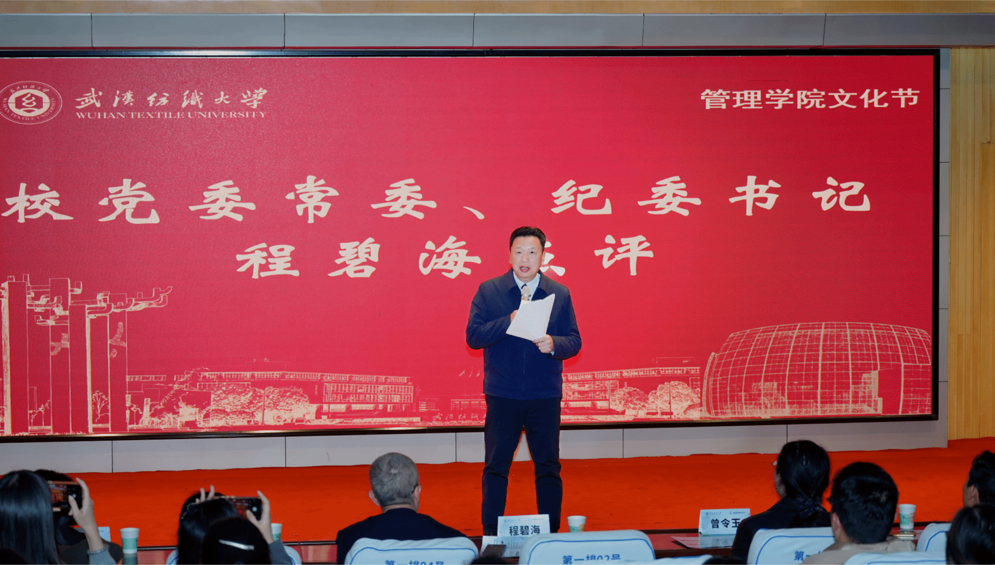 校党委常委、纪委书记程碧海教授为大赛作出点评,他指出活动的节目质量高,通过朗诵、舞蹈、书法等多元节目形式呈现了较强的故事性、趣味性和教育性,各学院的广泛参与,进一步凝聚了校园向心力,生动展现了校园文化的丰富内涵。他围绕在校学生如何成为廉洁文化的积极参与者提出四点建议,一是要以廉洁典范为引领,弘扬互助奉献精神,共同塑造纺大特有的精神风貌与校园风气,让每位学子都成为廉洁校园的参与者;二是严守纪律规矩,恪守诚实守信底线,主动成为优良学风的践行者;三是要勤俭节约,守护清风正气,争做良好家风的推动者;四是扣好人生廉洁的第一粒扣子,严格要求自己,守住底线和初心,成为廉洁自律的引领者。最后,程碧海教授为同学们送上寄语:“经纬纵横织锦绣,青春底色荟群英,不染尘间浊浪涌,但留明月照风骨。”