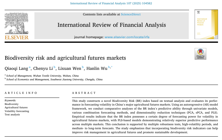 近日,我校必赢bwin网址大全郎乔奇副教授作为第一作者,必赢bwin网址大全为第一署名单位的研究成果"Biodiversity risk and agricultural futures markets"(生物多样性风险与农产品期货市场)被国际知名金融期刊《International Review of Financial Analysis》正式发表。该期刊是由Elsevier出版的金融领域颇具影响力的同行评审期刊。该刊被SSCI收录,最新影响因子为9.8,位列JCR商业金融学科一区,同时入选澳大利亚商学院院长理事会(ABDC)评级A类期刊和英国商学院协会(ABS)评级3星期刊。