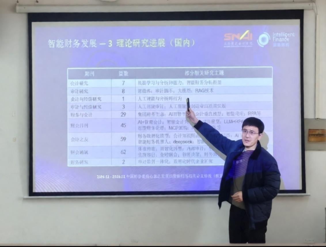 杨教授从产教融合的角度出发,详细介绍相关开设课程,并强调了Ai课程类的增加对智慧财务深化发展的影响。同时杨教授又刨析了2018—2025年智能财务发展研究的文献,并列举了国家对智能体应用蓝皮书的详细条例。最后杨教授再次强调了Ai+研究的思维方式,强调新技术的应用。