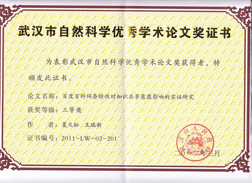 近日,从武汉市政府奖励办公室获悉,我校必赢bwin网址大全夏火松教授论文《百度百科词条特性对知识共享意愿影响的实证研究》喜获第二届武汉市人民政府自然科学优秀学术论文奖三等奖。