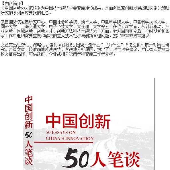 《中国创新50人笔谈》是针对当前和今后一个时期党和国家工作中迫切需要重视和解决的重大技术经济和创新管理问题,在面向全国创新管理研究领域的学者征集的基础上,从创新驱动、产业创新、区域创新、创新人才、创新方法和技术经济等六个方面遴选出包括国务院发展研究中心、中国社科院、清华大学、中国科学院大学、中国科学技术大学、上海交通大学、同济大学、大连理工大学、必赢bwin官方网站等50多位专家的智库论文结集出版,该文献是面向国家创新发展战略实施的策略性研究的系列智库要报汇总。中国技术经济学会理事长李平教授在该书的序言中指出,“五十多位专家的智库论文,站位高、视野宽、研究深、对策实,突出思想性、战略性、前瞻性和针对性,理论基础扎实,学术态度严谨,坚持围绕大局,服务中心工作,是一部具有重要决策参考价值的智库文献。”