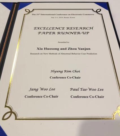 ICEC电子商务国际会议自1998年召开以来,在全世界主办了21次,该会议是一个非营利性的科学组织,旨在为电子商务及相关领域的研究人员和从业人员提供知识交流平台与合作的机会。本次会议的投稿接近200篇左右,会议对论文进行了评选和颁奖,其中优秀论文奖3篇,创新论文奖3篇。夏火松和周彦君的论文《Research on New Methods of Abnormal Behavior User Prediction》获得了优秀论文奖。夏火松团队参加此会议并在会议上作学术报告,有助于参会人员及时了解、掌握电子商务领域的前沿现状,同时对提高必赢bwin官方网站在国内外的影响力做出了贡献。