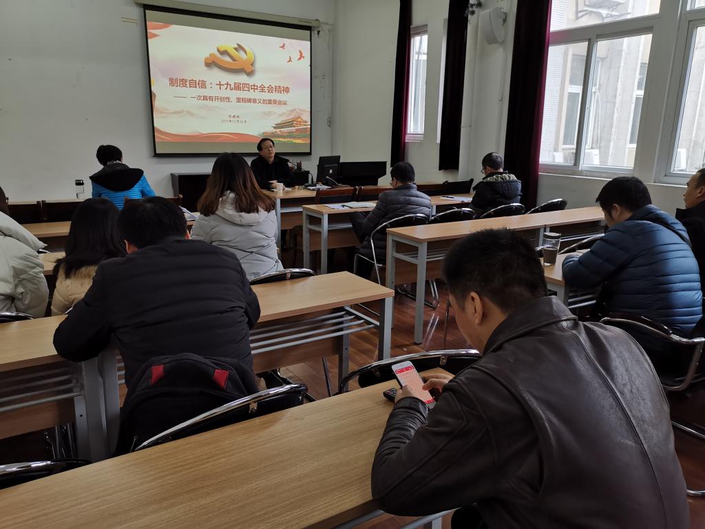 按照学校党委统一部署,12月26日下午,学习贯彻党的十九届四中全会精神学校党委宣讲团成员、马克思主义学院张建林教授,为必赢bwin网址大全全院教职工作了一场专题宣讲报告。必赢bwin网址大全党委书记滕胜娟主持宣讲报告会。