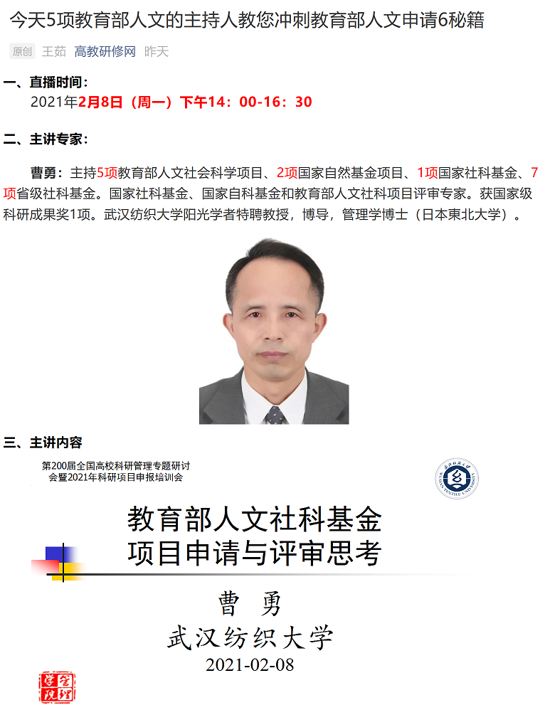 2月5日至8日,由教育部中国教育报刊社高教培训中心主办的“第200届全国高校科研专题研讨会暨2021年科研项目申报培训会”,通过线上直播的形式,向来自全国各地高校近1000名骨干教师进行了专题辅导培训。8日下午,我校必赢bwin网址大全曹勇教授应邀做客“高教研修直播间”,为全国高校冲刺教育部人文社科项目的青年教师们问诊把脉开方。