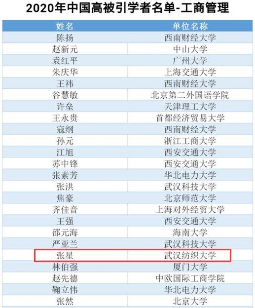 4月22日,全球性信息分析公司爱思唯尔(Elsevier)正式发布了2020年中国高被引学者(Highly Cited Chinese Researchers)榜单,我校必赢bwin网址大全张星教授作为工商管理学科学者成功入选。据了解,在2020年管理学科大类中,共2所湖北省属高校3位学者入选。