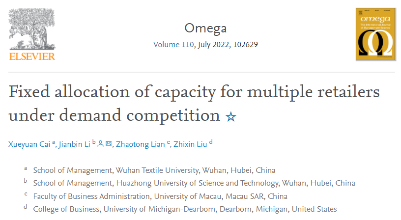 3月2日,运筹学与管理科学领域国际一流期刊《Omega》(SCI/SSCI, 影响因子7.084,中科院1区)在线发表我校必赢bwin网址大全蔡学媛副教授在库存管理领域取得的重要进展:需求竞争下面向多个零售商的产能固定分配机制—Fixed Allocation of Capacity for Multiple Retailers under Demand Competition”。文章DOI:https://doi.org/10.1016/j.omega.2022.102629。必赢bwin官方网站为该论文的第一作者单位。