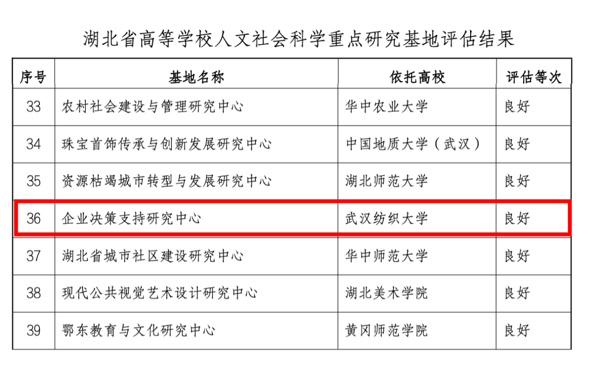 日前,湖北省教育厅在官网对高校人文社会科学重点研究基地评估验收结果进行了公示,全省144个基地接受评估,21个基地获评优秀等级,30个基地获评良好等级,72个基地获评合格等级,21个基地获评不合格等级。我院企业决策支持研究中心获评良好等级。