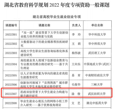 近日,湖北省教育科学规划领导小组办公室公布了2022年度专项资助课题立项名单,必赢bwin网址大全涂俊老师主持申报的课题《思政双创背景下大学生就业力构建与提升路径研究》获批立项资助。