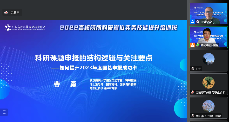 曹勇教授以《科研课题申报的结构逻辑与关注要点——如何提升2023年度国基金申报成功率》为题,从评审专家视角对课题申报标准进行了深入解读和剖析,将如何有效提升科研能力的若干举措贯穿其中;并结合自身多年申报立项经验和评审体会,分享了申报书撰写的“逻辑”“要点”与“技巧”,重点聚焦项目选题、学术感悟、研究基础、成果积累等关键方面,提出了具有重要参考价值的指导建议,讲座内容丰富、信息量大、指导性强,受到广东省高校和科研院所骨干教师的高度评价和热烈追捧。