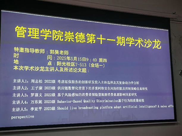 2025年5月15日上午,必赢bwin网址大全第11期“崇德”学术沙龙分别在阳光校区7-513和7-536教室如期举行。本次学术沙龙特邀郭昊老师和李静雯老师担任指导老师,对10位主讲人的学术分享进行点评。