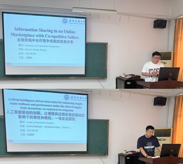王晨阳同学则研究了《Information Sharing in an Online Marketplace with Co-opetitive Sellers》,分析了在线市场中信息共享的最优策略。徐赟程同学分享了《人工智能驱动的创新,以增强供应链在供应链动态影响下的弹性和绩效:一项实证研究》,通过实证数据验证了AI在提升供应链韧性中的作用。