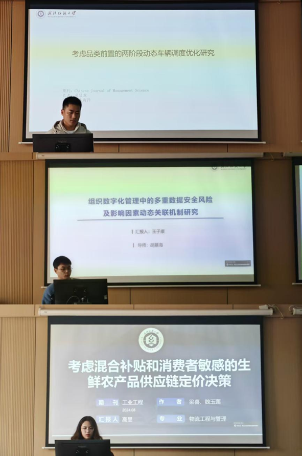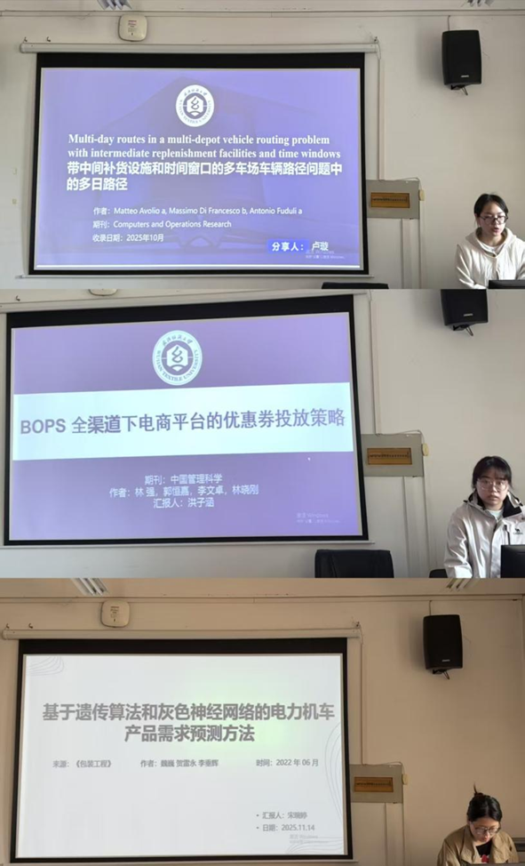 分会场7-536教室,卢璇同学分享的论文《Multi-day routes in a multi-depot vehicle routing problem with intermediate replenishment facilities and time windows》,针对带中间补货设施和时间窗口的异构车队多车场车辆路径问题,数值实验表明多日线路径可显著节省成本。洪子涵同学以《BOPS 全渠道下电商平台的优惠券投放策略》进行汇报,探讨平台企业在BOPS全渠道下电商平台优惠券投放前后的决策模型,以及投放策略及对零售商与消费者的影响。宋琬婷同学聚焦《基于遗传算法和灰色神经网络的电力机车产品需求预测方法》,针对灰色神经网络预测小数据非线性系统的不足,提出一种耦合遗传算法的灰色神经网络预测方法。