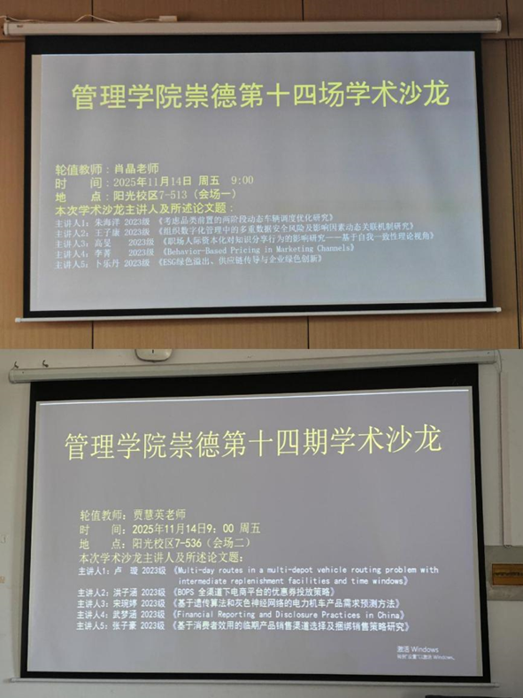 2025年11月14日上午,必赢bwin网址大全第14期“崇德”学术沙龙分别在阳光校区7-513教室和7-536教室如期举行。本次沙龙特邀肖晶老师和贾慧英老师担任指导老师,对10位主讲人的学术分享进行点评。