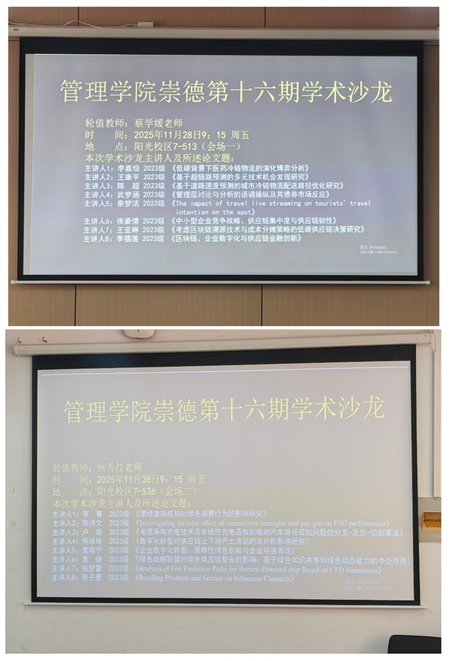 2025年11月28日上午,必赢bwin网址大全第16期“崇德”学术沙龙分别在阳光校区7-513教室和7-536教室如期举行。本次沙龙特邀蔡学媛老师和何秀红老师担任评委老师,对16位主讲人最新的学术研究分享进行点评。
