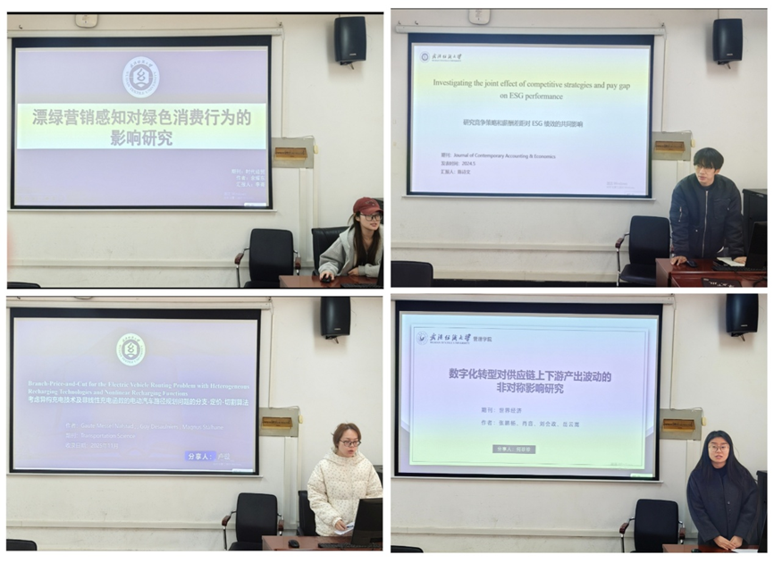 随后,秦梦洁同学汇报了论文《The impact of travel live streaming on tourists’ travel intention on the spot》基于SOR框架,通过文本挖掘与结构方程模型,揭示主播特质与内容特征对游客决策的双路径作用。侯豪情同学通过《中小型企业竞争战略、供应链集中度与供应链韧性》分享基于资源基础观,提出“竞争战略-集中度-韧性”理论链,并引入竞争强度作为调节变量。接着,王亚琳同学汇报了《考虑区块链溯源技术与成本分摊策略的低碳供应链决策研究》详细分析了区块链技术投入下的成本分摊契约,探讨不同分摊结构对供应链协调的优化作用。最后,李蓓莲同学聚焦《区块链、企业数字化与供应链金融创新》论证区块链共识机制如何通过信息质量提升,推动数字供应链金融成为普惠性融资工具。