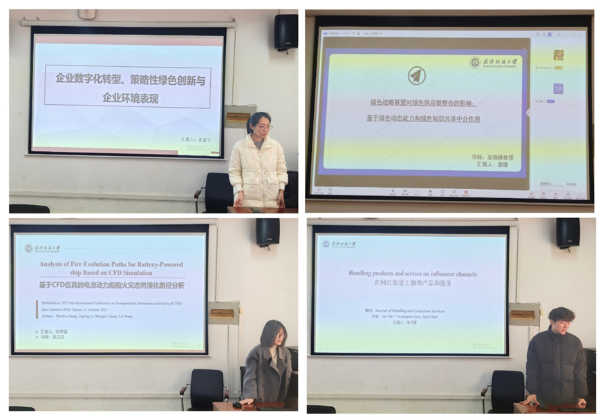 接着,袁瑞宁同学汇报了《企业数字化转型、策略性绿色创新与企业环境表现》数字化转型整体提升环境表现,但绿色债券可能扭曲创新动机,导致非国企与制造业更倾向策略性创新。袁缘同学则通过线上汇报探讨了《绿色战略联盟对绿色供应链整合的影响:基于绿色知识共享和绿色动态能力的中介作用》来验证绿色动态能力与知识共享的中介作用,并强调利益相关者压力对联盟效果的调节。张梦蕾则研究了《Analysis of Fire Evolution Paths for Battery-Powered ship Based on CFD Simulation》通过仿真划分火灾发展路径,指出电池高温复燃风险,呼吁优化消防系统与应急策略。最后,张子豪同学分享了《Bundling products and service on influencer channels》通过比较捆绑与分开定价模式,揭示服务成本与产品缺陷率对制造商盈利与网红促销策略的影响。